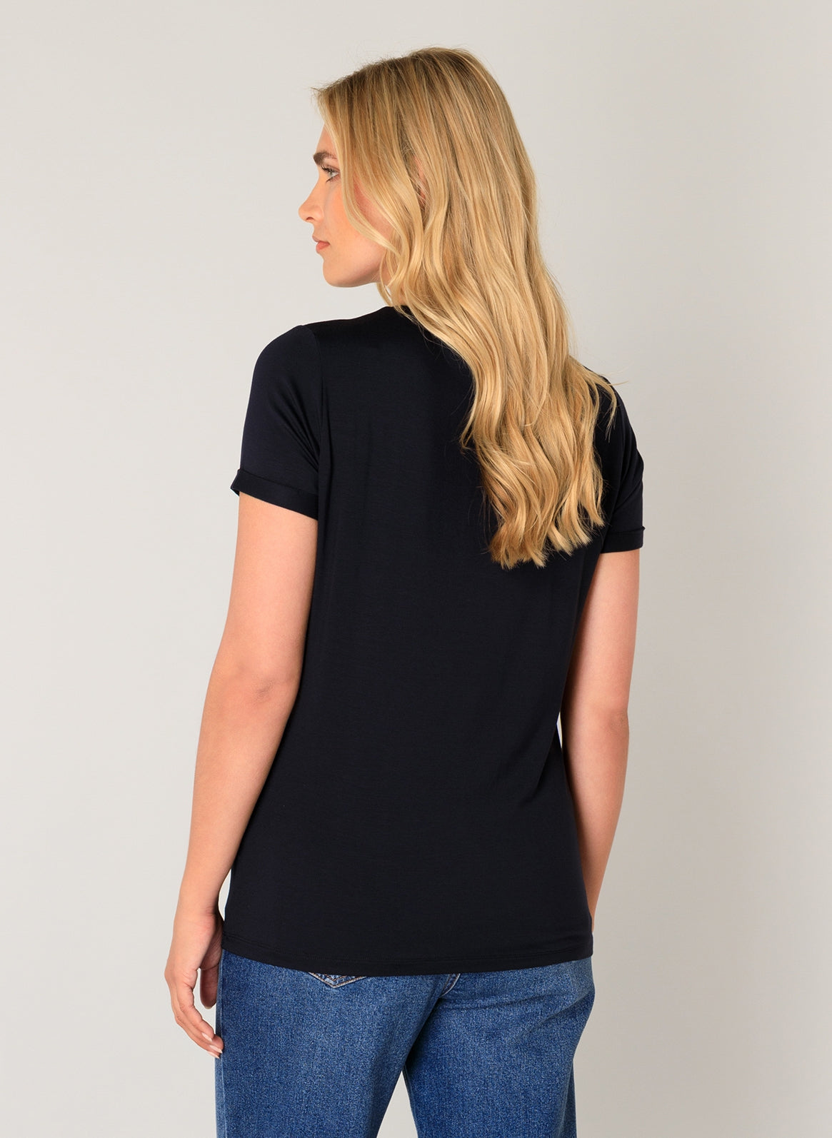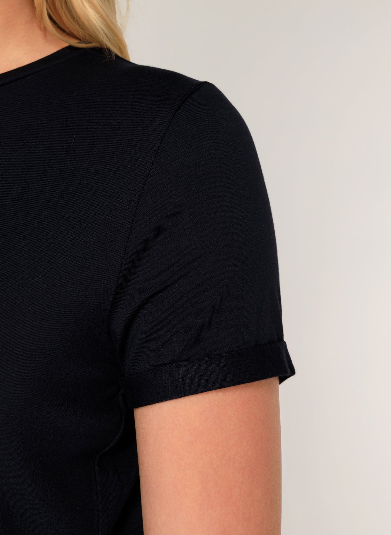 Description: Yalba is a classic T-shirt in a supple viscose blend with a round neckline and a folded hem on the sleeves. It is made of a lightweight fabrication and is wonderful on its own or under a jacket.