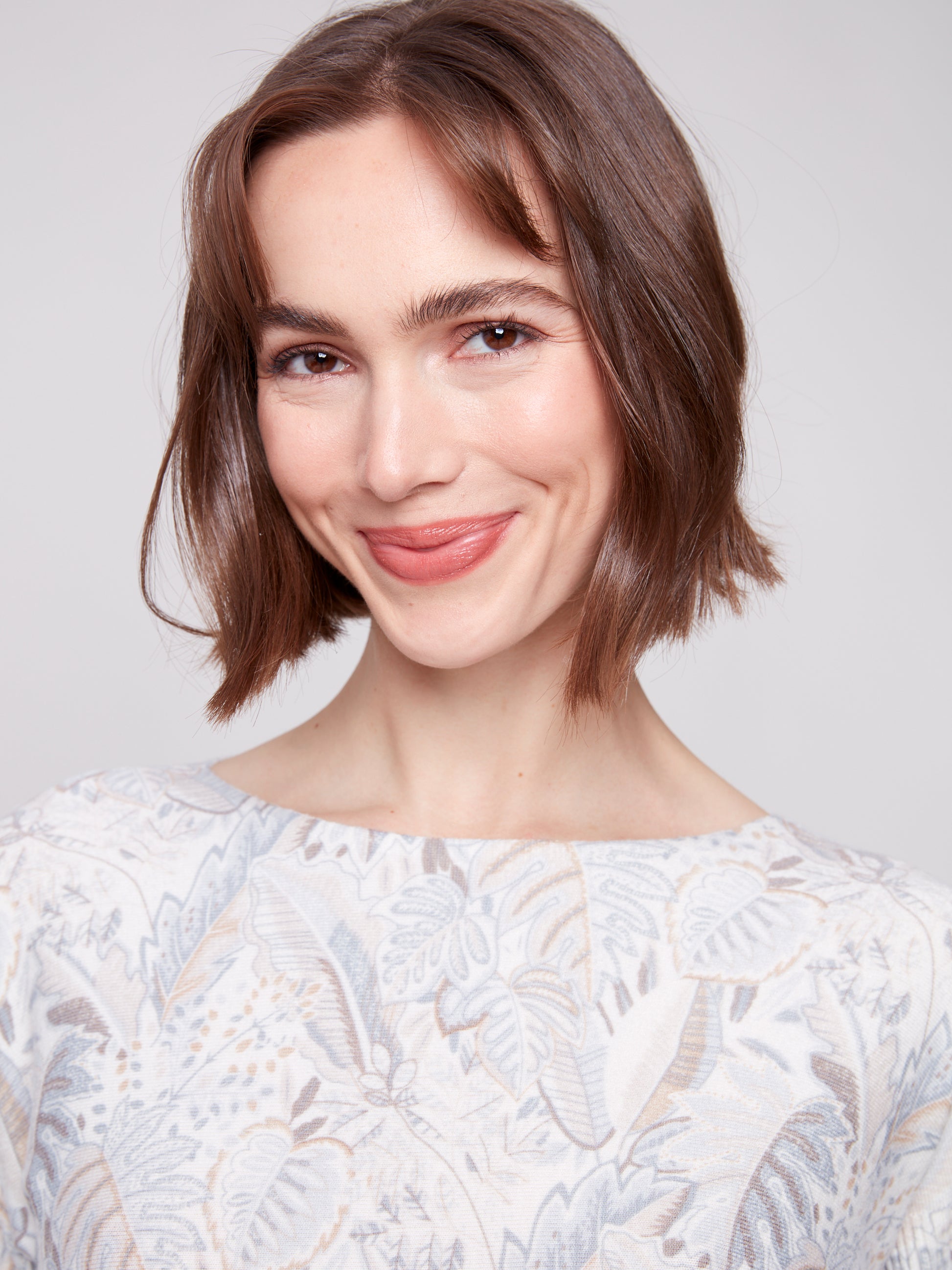 Description: Charlie B's foliage print sweater is the ideal piece to transition seasons with its lightweight knit! It is so pretty with its soft shades of blue, grey and walnut against an ecru background, and its lovely details of a shirttail hem, and rib knit sides and hem. It looks great paired with their denim or with their natural and truffle coloured jeans.