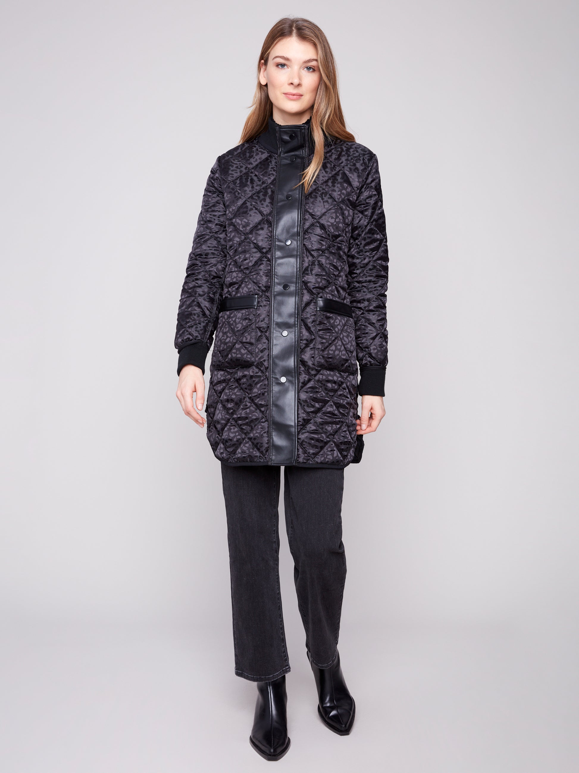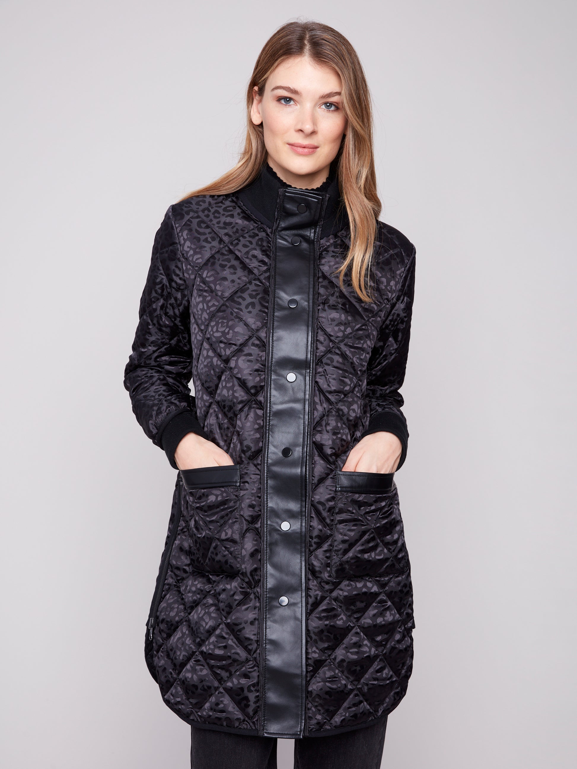 Description: Get two fabulous looks in one with Charlie B's reversible puffer jacket! It is beautifully detailed in a solid black nylon on one side and an animal print with sheen on the other side. There is a faux leather front placket, and trim on the patch pockets and sides where the zippers end. Additional finishing touches include the rib knit collar and cuffs, and the shirttail hem that's neatly trimmed with seam binding.