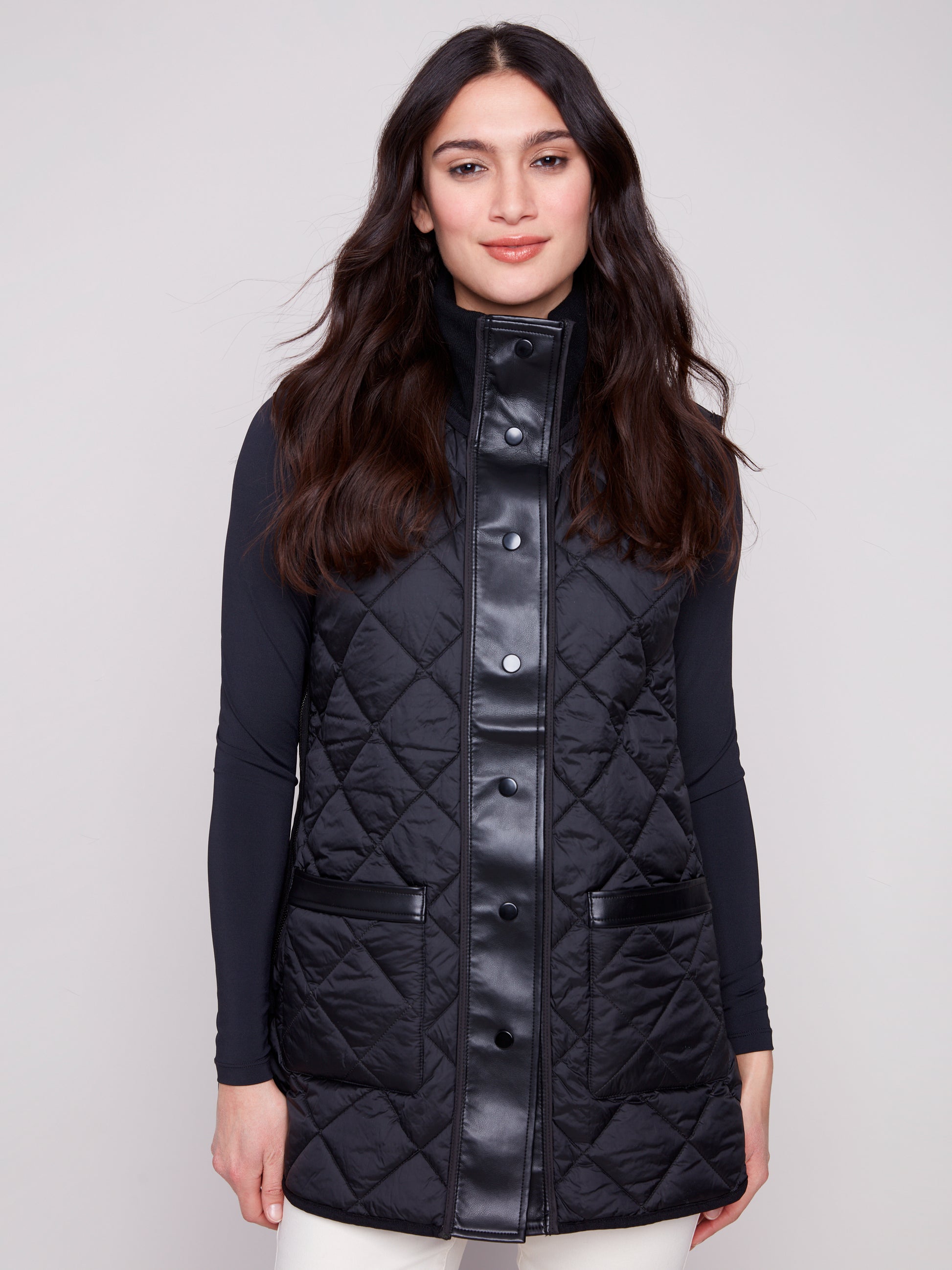 Description: Charlie B's vests are always a big hit and you can see why! This is their reversible style with the rich shade of spruce on the exterior, and solid black on the interior side. The fabrication has a subtle sheen which adds to its appeal, and it is beautifully finished with faux leather placket and trim on the front pockets of both sides, and rib knit on the collar.