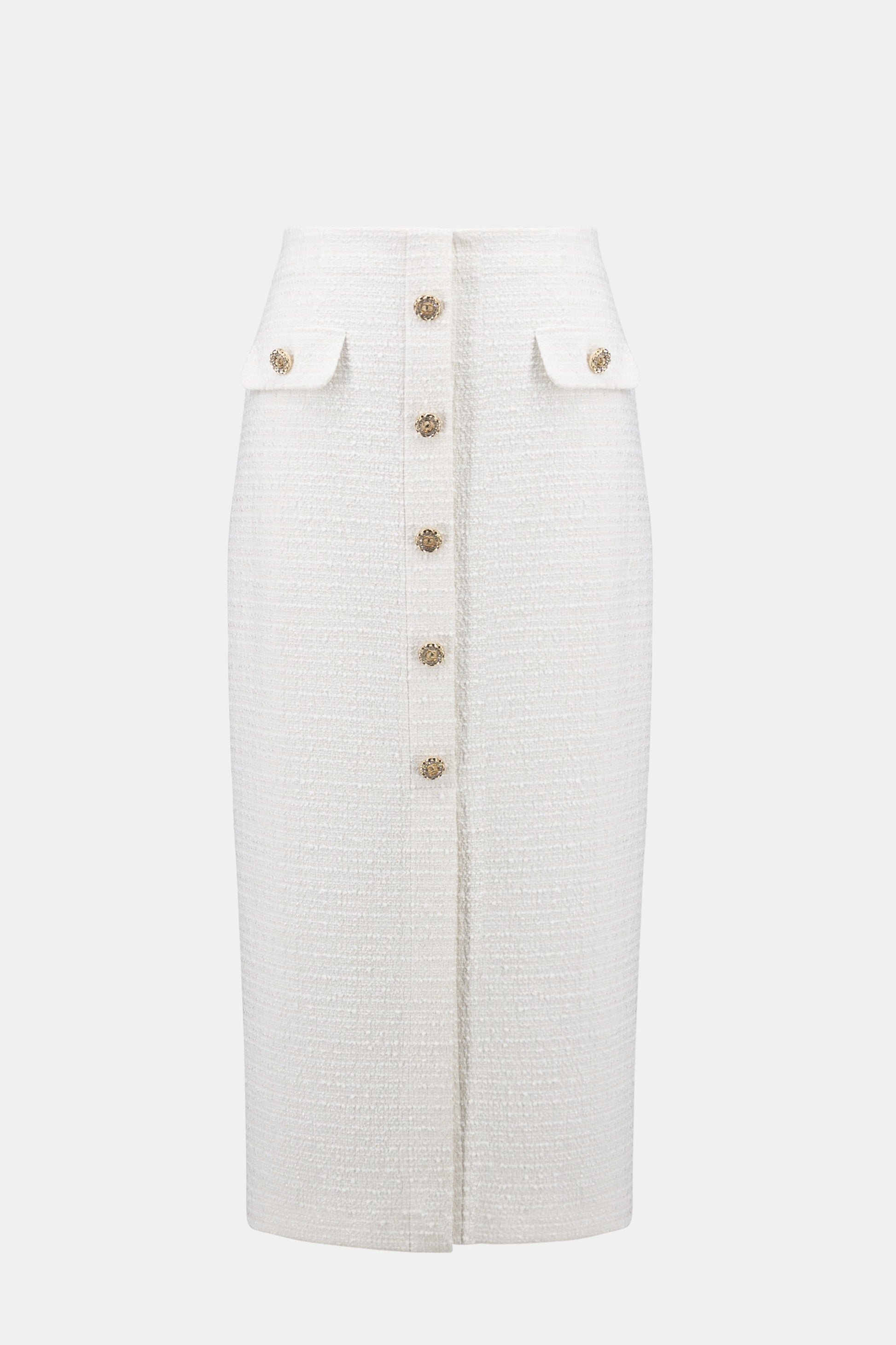 Description: Classic texture meets modern polish in this bouclé skirt. Designed with a straight silhouette, it features a split hem, faux pocket flaps, and gold button trim for a touch of detail.