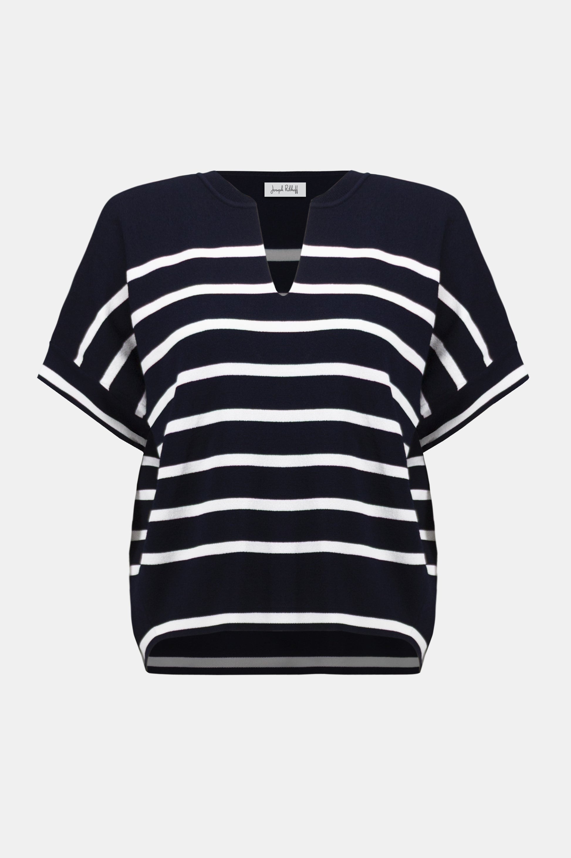 Description: Joseph Ribkoff's striped sweater, crafted from dry viscose and nylon, features a relaxed high-low hem and a notched V-neckline. Its short dolman sleeves and boxy silhouette make it an easy, casual piece for any occasion. Additional details include slightly tapered sides and a high-low hem. NOTE: Due to the looser shape, you can go down 1 size if you wish.