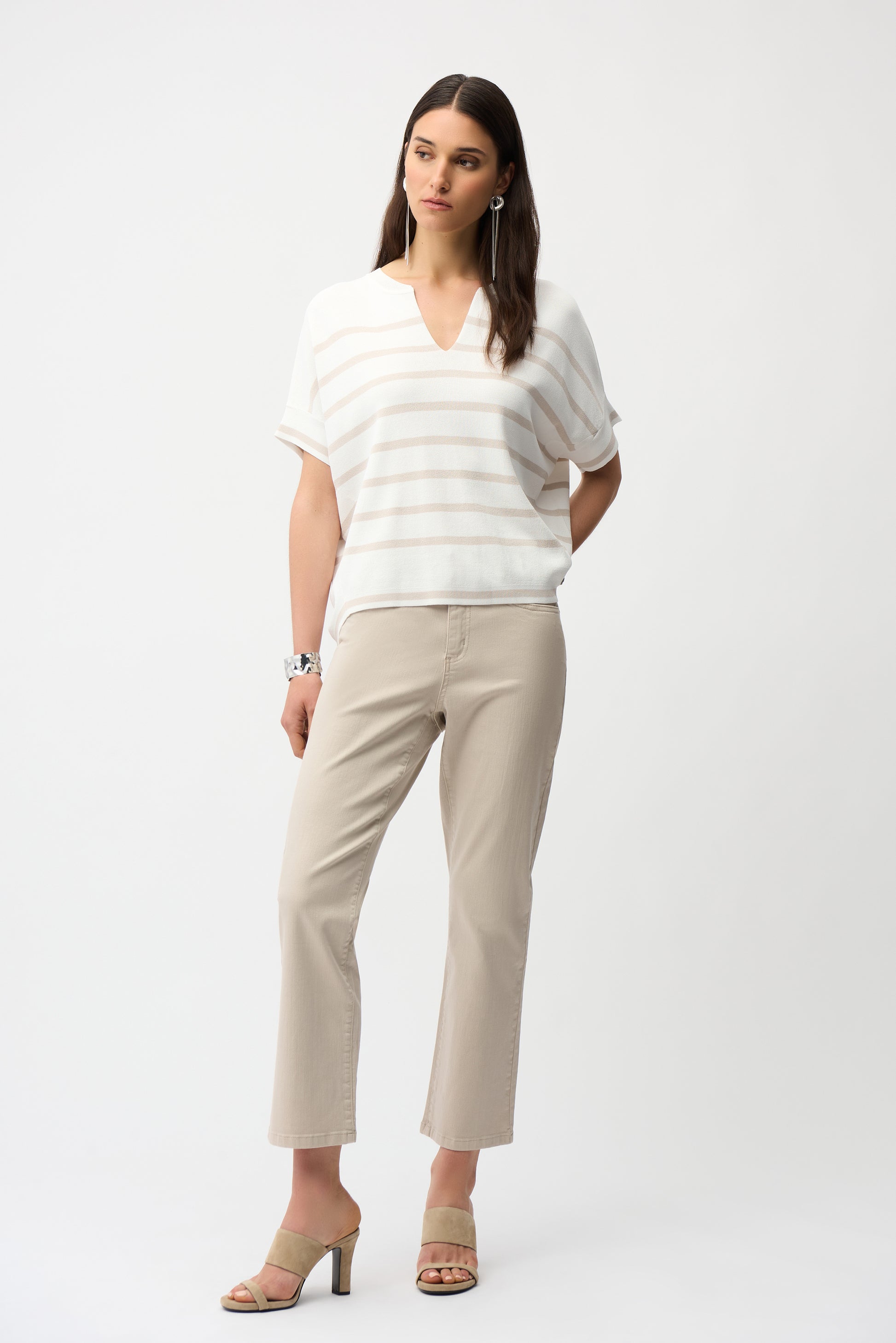 Description: Joseph Ribkoff's striped sweater, crafted from dry viscose and nylon, features a relaxed high-low hem and a notched V-neckline. Its short dolman sleeves and boxy silhouette make it an easy, casual piece for any occasion. Additional details include slightly tapered sides and a high-low hem. NOTE: Due to the looser shape, you can go down 1 size if you wish.