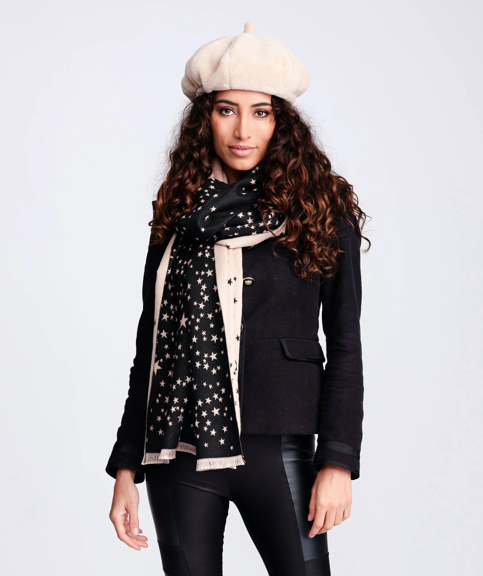 Description: Elevate your accessory game with the Black Reversible Star Print Scarf. Featuring a striking star print and a chic bi-colour reversible design, this versatile scarf effortlessly blends style and practicality. Perfect for any season, it adds a touch of bold sophistication to casual or formal outfits while ensuring comfort and elegance.