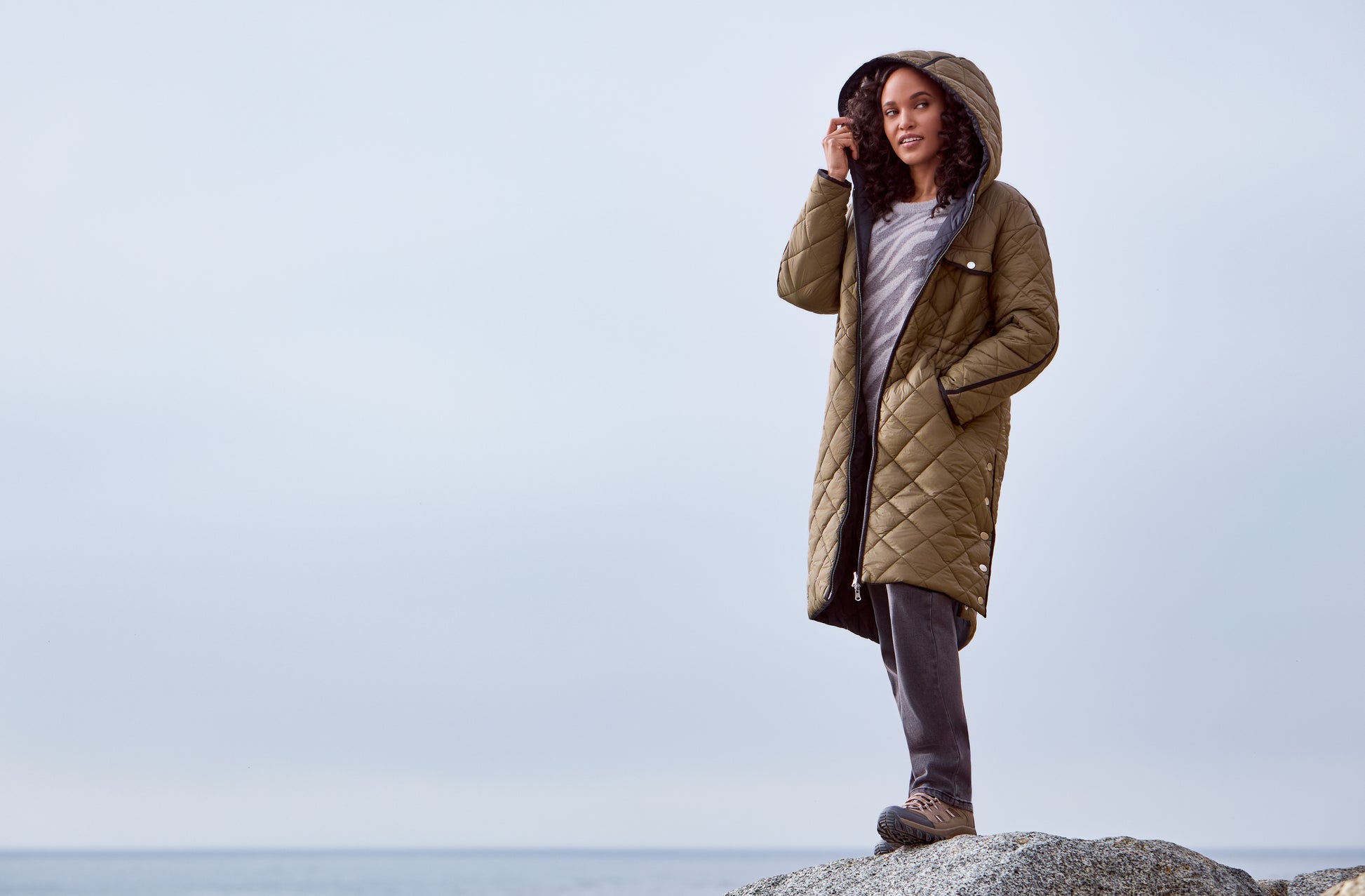 Description: Enjoy Tribal's lightweight puffer coat that offers warmth and versatility with its reversible design! On the ivy side, it's beautifully finished with black trim on the back, sleeves, hood, and side slits with snap closures. It also has a total of four front pockets, two on top and two at the hip level. Reversed, the black side has two front pockets and a drawcord waist with toggles.